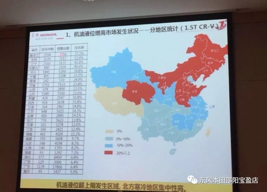 報(bào)告中顯示,全國(guó)共計(jì)接到投訴20742起,機(jī)油液位超上限發(fā)生區(qū)域主要以北方寒冷地區(qū)為主,黑龍江為例,1.5TCR-V銷售臺(tái)數(shù)達(dá)到3356量,投訴件數(shù)達(dá)到2594個(gè),投訴率達(dá)到77.3%。