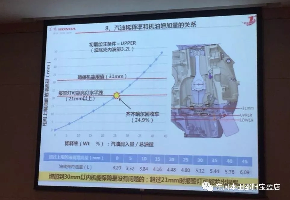 報(bào)告中稱,當(dāng)機(jī)油超標(biāo)尺上限31mm時(shí),出現(xiàn)油壓波動(dòng)、PCV通道被堵塞,無(wú)法保證發(fā)動(dòng)機(jī)技能。從汽油稀釋率和機(jī)油增加量的關(guān)系來(lái)看,而增加到30mm以內(nèi)機(jī)能保障是沒(méi)有問(wèn)題的,超過(guò)21mm時(shí)報(bào)警燈可能發(fā)出提醒。